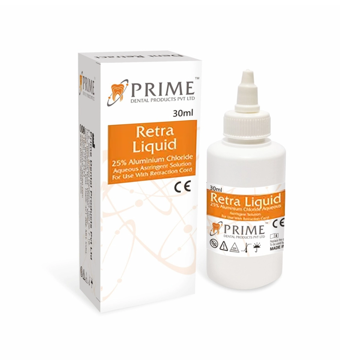 El hemostático líquido Retra Liquid Prime Dental 30 ml es un agente clínico formulado con cloruro de aluminio al 25 %, diseñado para controlar eficazmente el sangrado gingival y facilitar la retracción química del surco. Gracias a su presentación líquida transparente, permite un manejo seguro en procedimientos restaurativos y estéticos, sin dejar manchas ni interferir en el resultado final.
